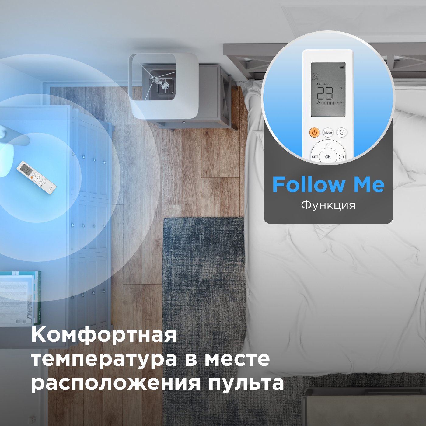 - Локальный комфорт Follow me – датчик на пульте управления отслеживает температуру вблизи пользователя, обеспечивая индивидуальный комфорт.